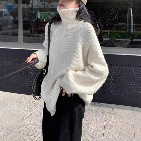 Loose, Mid-Length Effortless-Style Knitted Sweater For Women With Side Zipper And Lapel DesignLoose, Mid-Length Effortless-Style Knitted Sweater For Women With Side Zipper And Lapel Design